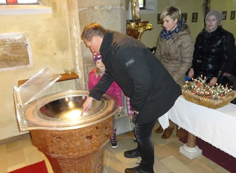 Wir haben versucht den Kinder zu erklären, dass nicht nur der Pfarrer segnen darf, sondern auch die Eltern die Kinder und auch umgekehrt. Beim Taufbecken in der Marienkirche segneten die Eltern die Kinder und jede Familie durfte sich ein Fläschchen Weihwasser mit nach Hause nehmen.