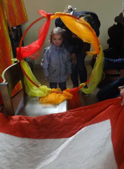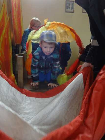 Alle Kinder, die genug Mut hatten, durften durch einen "brennenden" Reifen klettern und von einem Sessel in ein Sprungtuch hüpfen. Die beiden "Florianijünger" haben die Kinder aufgefangen.