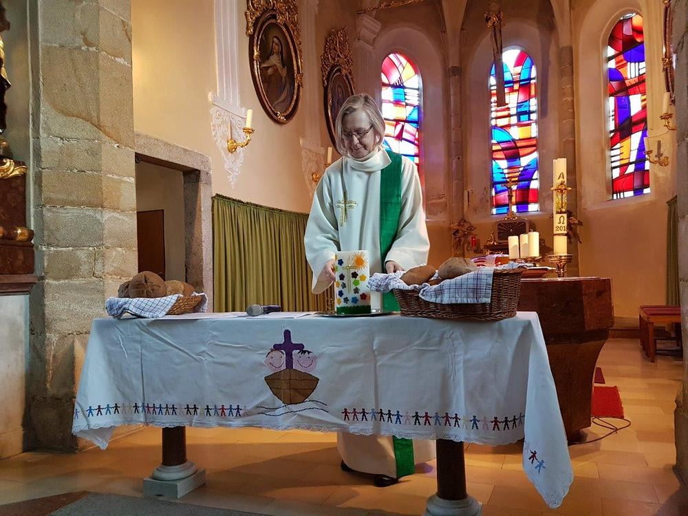 Jesus hat sich ganz besonders um seine Mitmenschen gekümmert und mit ihnen geteilt. Er hat uns gezeigt, dass wir, wenn wir teilen, bestimmt nicht ärmer werden und jeder genug haben wird. Die Geschichte von den 5 Broten und 2 Fischen, die genügt haben, um viele Menschen satt zu machen, wurde nachgespielt und zum Schluss erhielt jede Bankreihe einen Brotlaib, welcher mit allen Banknachbarn geteilt wurde. Wir dankten Jesus und luden abschließend zur Aktion „Weihnachten im Schuhkarton“ ein - eine Aktion, welche uns zeigt, dass Teilen sowohl die Beschenkten als auch uns und unsere Kinder als Schenker glücklich machen kann!